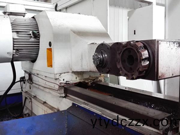火車鉤尾框承載面加工專機,本機床為臥式單面布置,前面數(shù)控移動工作臺上安裝有回轉(zhuǎn)夾具,后面數(shù)控移動工作臺上配有專用雙軸銑削動力頭。夾具具有自動回轉(zhuǎn)及回轉(zhuǎn)到位后自動鎖緊功能,回轉(zhuǎn)角度由固定擋鐵控制,更換品種時需更換擋鐵塊。本機床主要用于13B、17型、力拓40T鉤尾框承載面的銑削加工,生產(chǎn)節(jié)拍:4分鐘/件。工件以底面、側(cè)面及尾部定位,液壓油缸夾緊。人工吊裝上下料,一次一件,液壓夾緊,數(shù)控系統(tǒng)控制,并配有獨立的液壓站、電氣柜、集中潤滑裝置。本機床加工剛性好,并適合多品種加工。